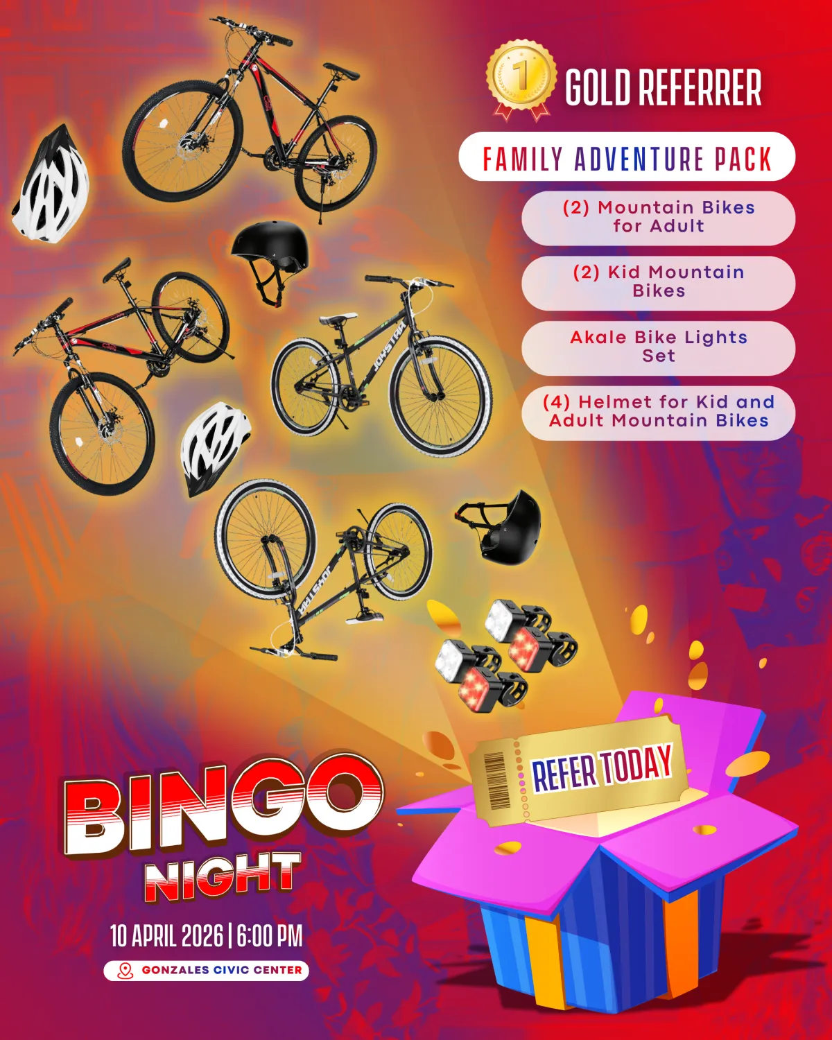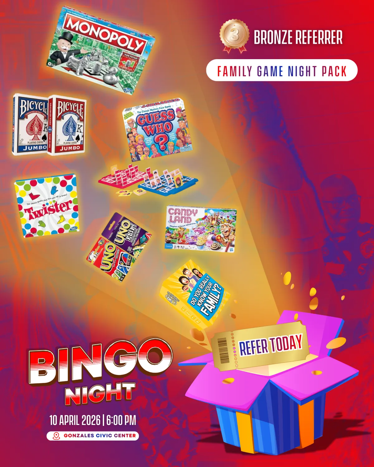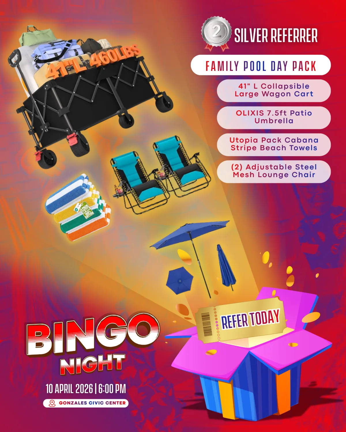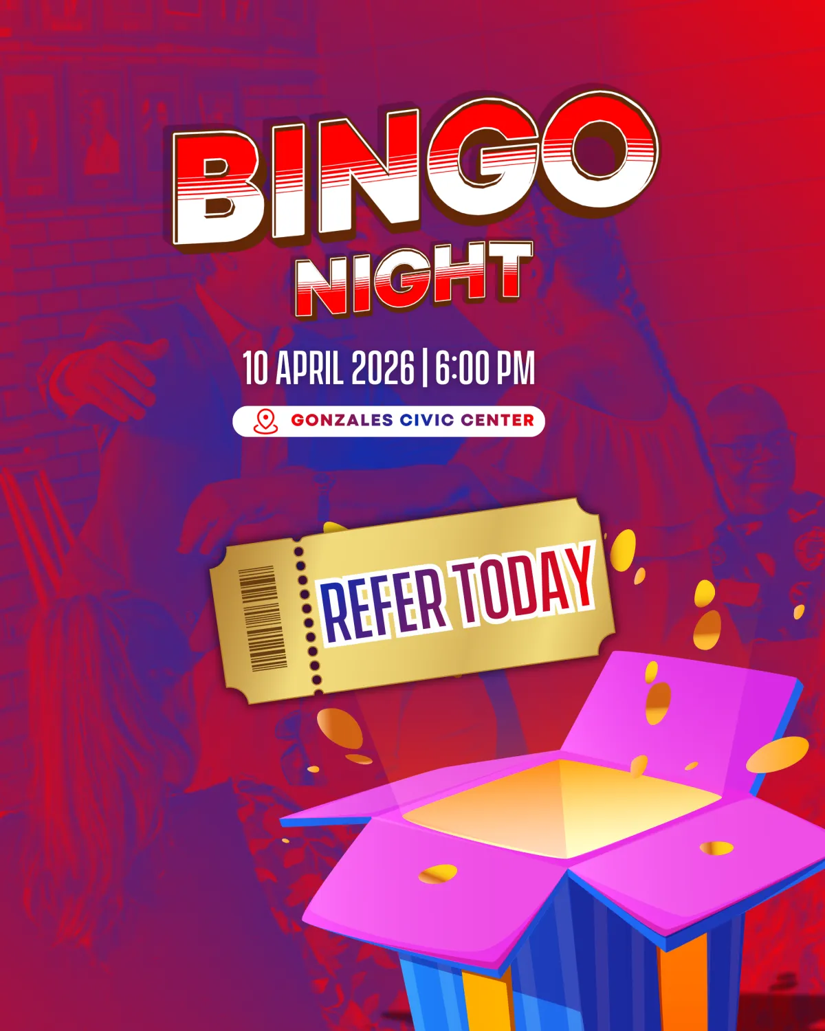 The event will take place on April 10, 2026, from 6:00 PM to 9:00 PM at the Gonzales Civic Center.